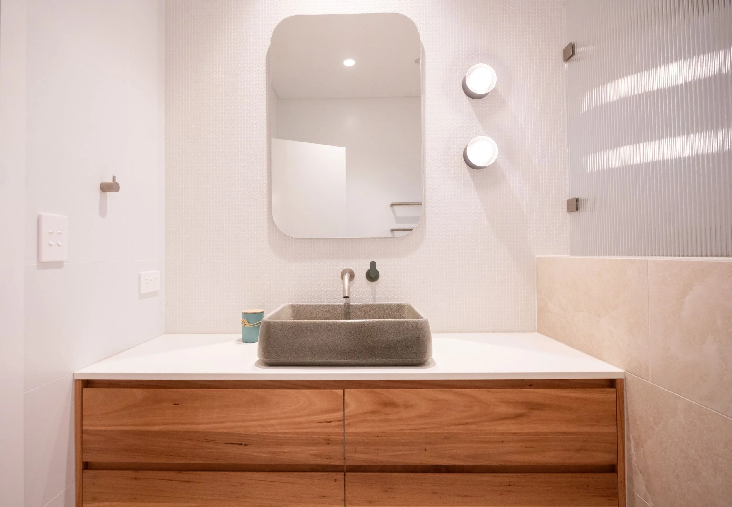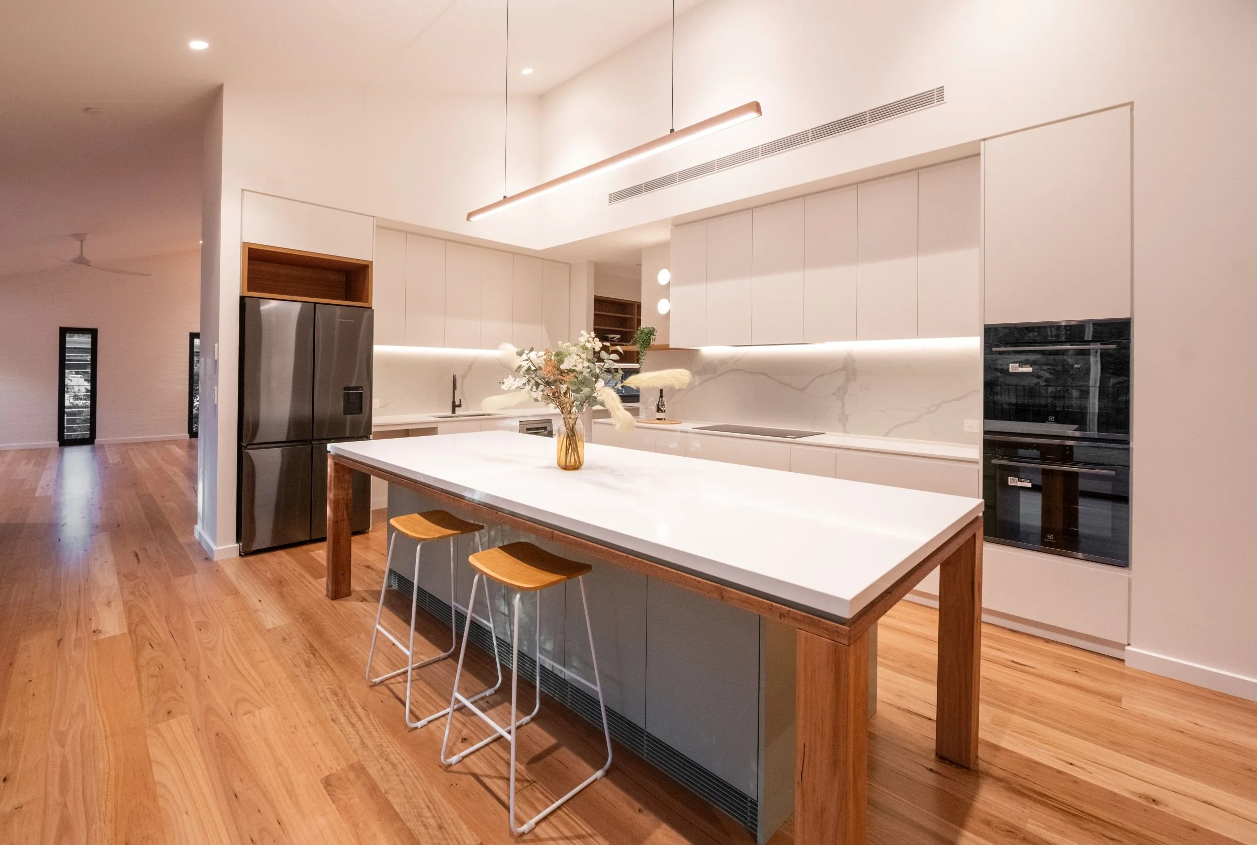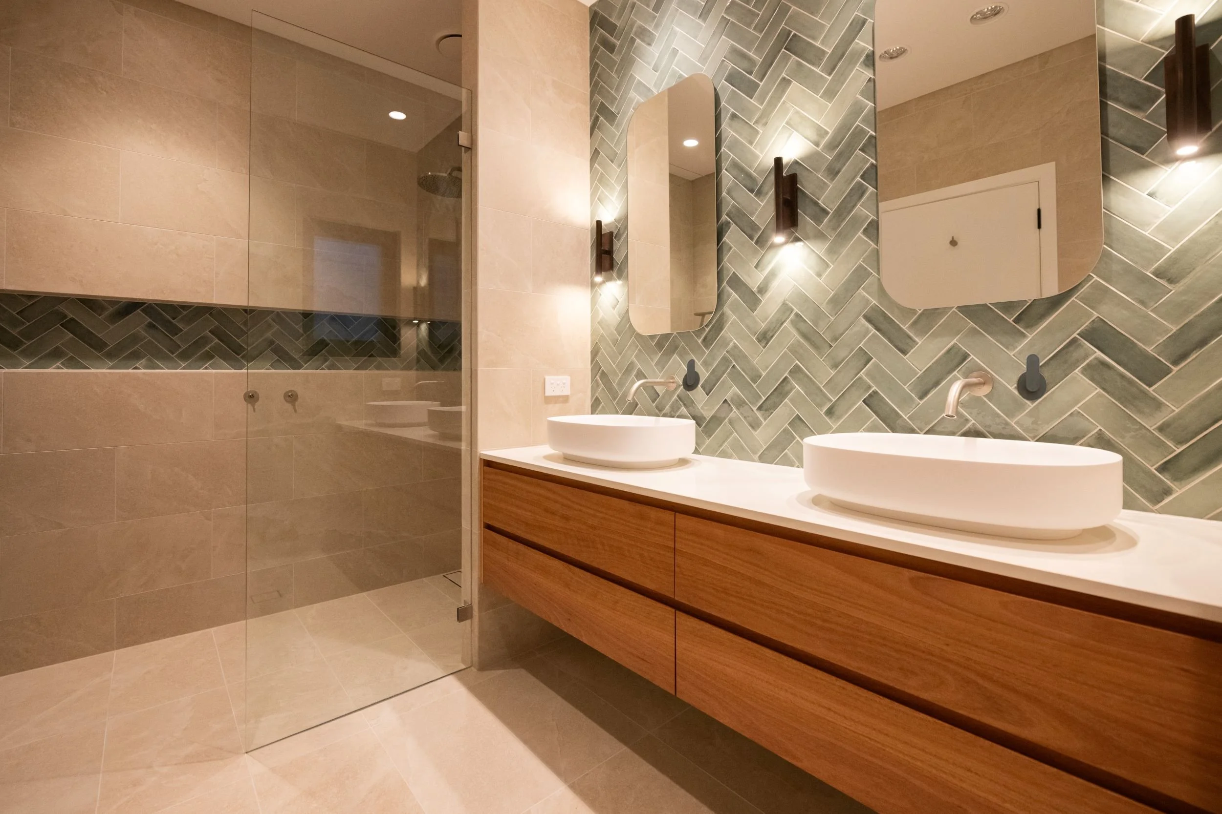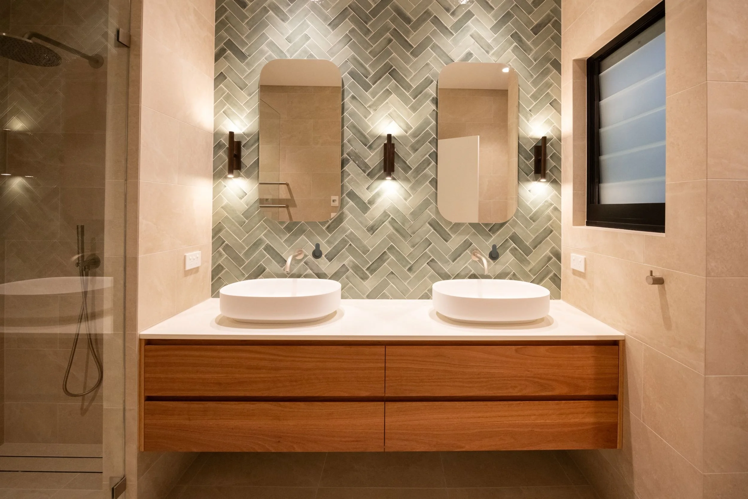 This renovation included 3 bedrooms, family room, kitchen, 2 bathrooms and laundry. The aim was to modernise the existing spaces and upgrade the kitchen and wet areas to ensure they are functional for the next stage of life for this family of five. The client engaged an interior designer to design the built-in furniture, kitchen and wet areas. We particularly liked the quality detailed joinery in this project and the grey herringbone pattern porcelain tiles. We built a nice integrated bulkhead unit over the TV area so that the AC ducting could be optimally located without detracting from the design of the room. This renovation is a good example of how selecting top end finishes and fittings significantly lifts the overall appearance of the living space.