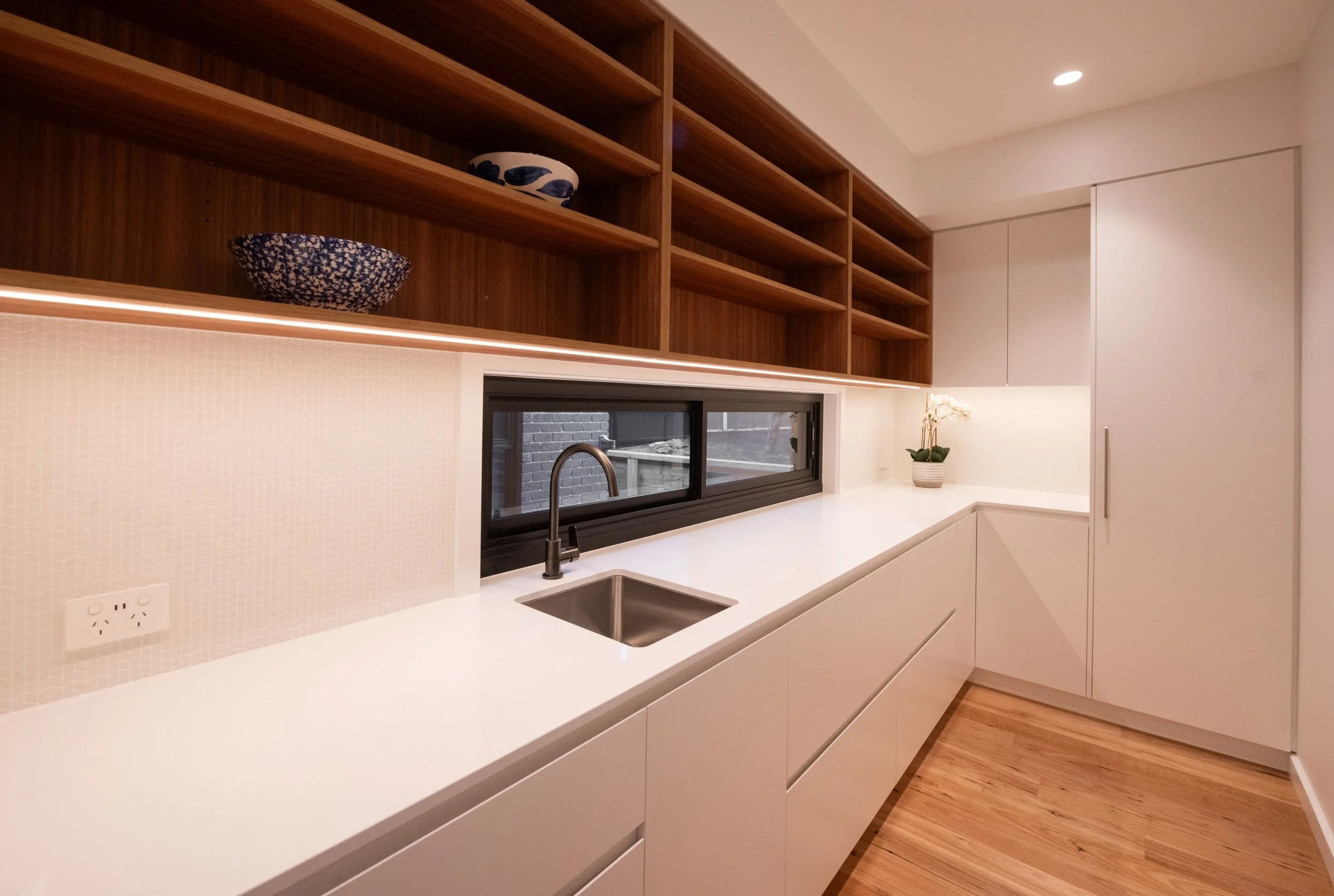 NuVision Building was fortunate to be involved with a high quality architecturally designed addition to a 1950’s cottage. Whilst externally the finishes are in keeping with a cottage feel, internally a very modern, clean lined, stylish theme was designed by the architect in close collaboration with the owners. The project involves the addition of a kitchen with butler’s pantry, lounge room, study nook and main bedroom and ensuite. Whilst the shadow lines, timber floor and kitchen are highlights, the standout feature is the raked curved ceiling with curved highlight window.